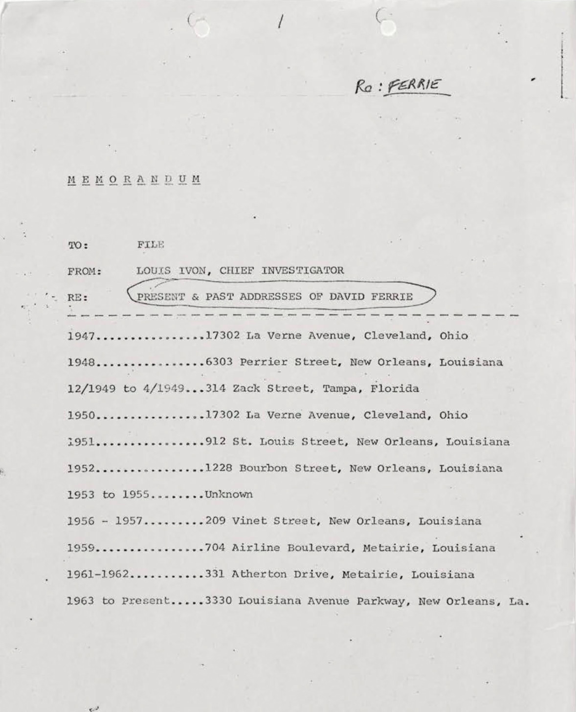 Although Ferrie became one of the most intensely investigated New Orleanians of the 20th century, according to a 1967 memorandum by chief investigator Louis Ivon of the Orleans Parish District Attorney’s Office, authorities were unable to determine where he resided from 1953 to 1955.8
