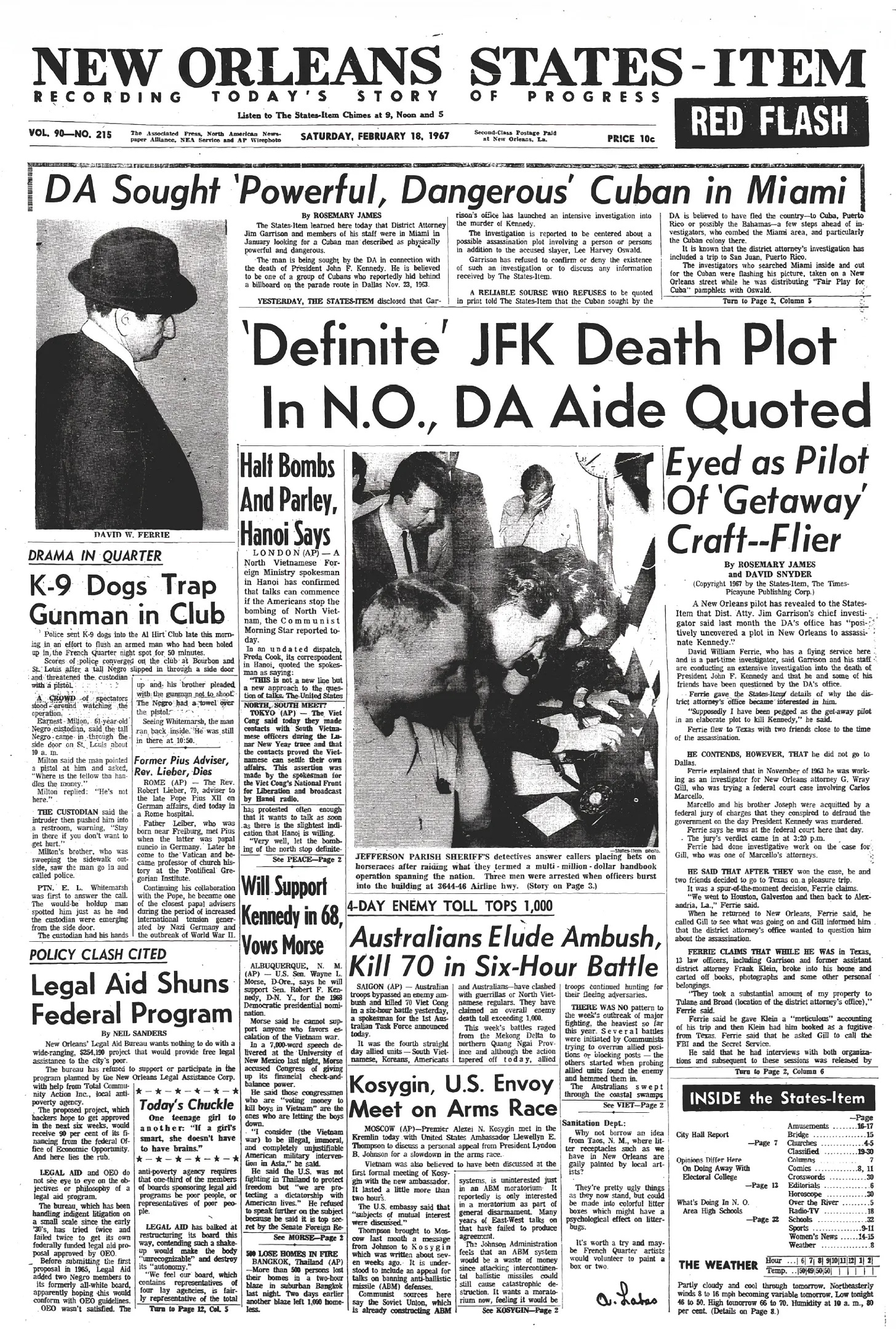 The night before, after reading the story in the States-Item, Ferrie decided to call their bluff. He phoned reporter David Snyder and declared himself to be Garrison’s prime suspect. Over the course of several hours, Ferrie pieced together and methodically dismantled Garrison’s case against him. That afternoon, the same afternoon that Moo Moo Sciambra and Lou Ivon showed up on the stoop of Ferrie’s home on Louisiana Avenue Parkway, the States-Item carried Snyder’s exclusive report about the elusive pilot at the epicenter of Garrison’s investigation. This time, Ferrie would out himself.