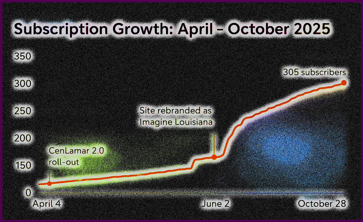 Two months later, having tripled the number of subscribers (184!), I rebranded and relaunched the site, upcycling an old name: Imagine Louisiana.